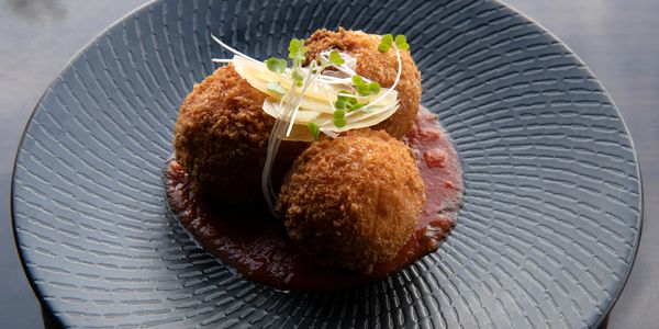 Crisp risotto balls with oozy bocconcini on a tangy tomato sauce